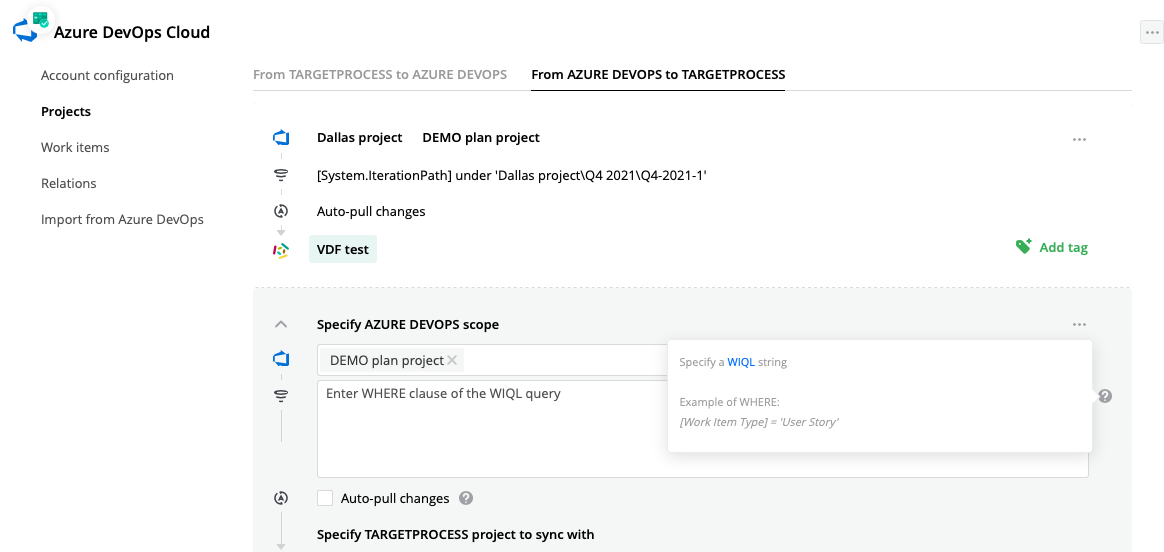 We are adding support for WIQL queries to support additional criteria in projects. This allows you to create more specific mappings–for example, pulling only specific data from Azure DevOps or mapping it to different projects in Targetprocess based on some defined criteria.