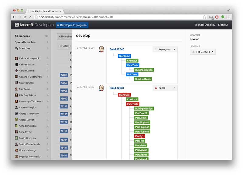 We have both problems in Targetprocess, to be honest. Slow tests were partially solved by parallelization. Now we have 60 virtual servers that run all tests, but still tests execution takes about 90 minutes (including unit tests, integration tests and functional UI tests). We have implemented an internal system that integrates together Jenkins, Git and Targetprocess: