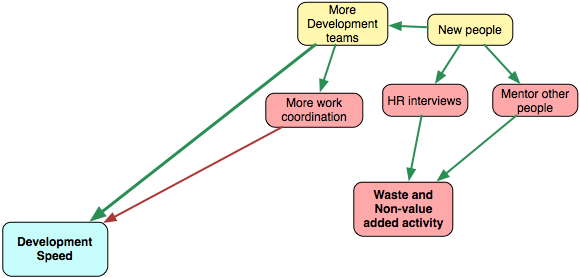 Red arrow indicates decreasing effect. For example, better development skills decrease system complexity (good engineers create less complex systems).
