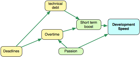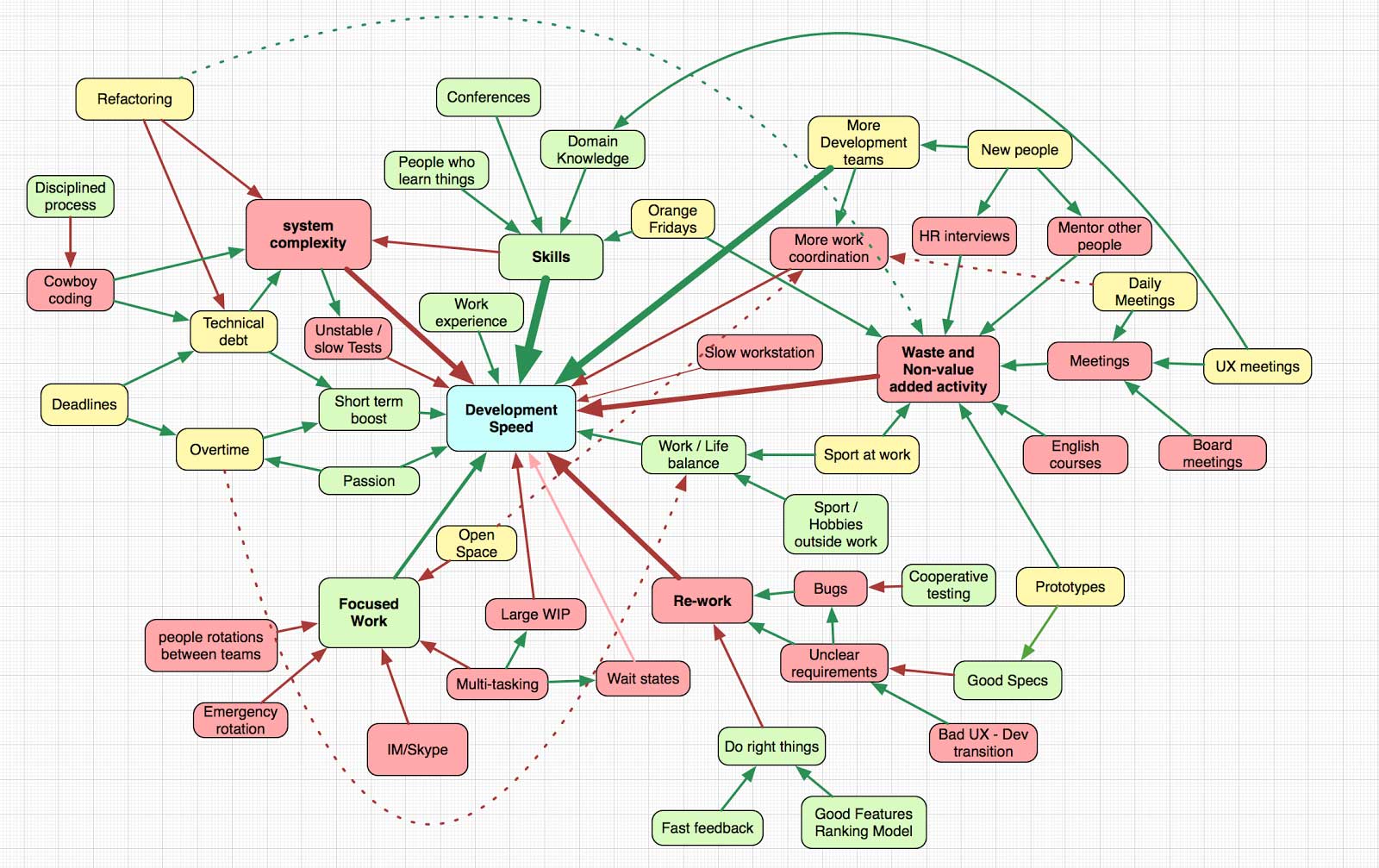 Now you can look at the diagram and ask questions like: What increases development speed? What decreases it? What can we do to create software faster (and better!)? The model may be imperfect and that is OK. You are free to modify it.