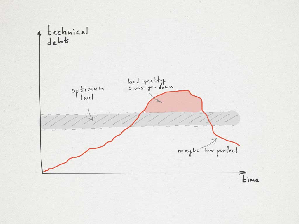 The picture shows technical debt and its interest grow over time if not resolved. Growth can be fast or slow, depending on the debt accumulation velocity. Overall, there is always some technical debt in a system and it is economically impractical to have zero debt, it will slow delivery of new features. Henrik Kniberg has an interesting perspective on technical debt as well.
